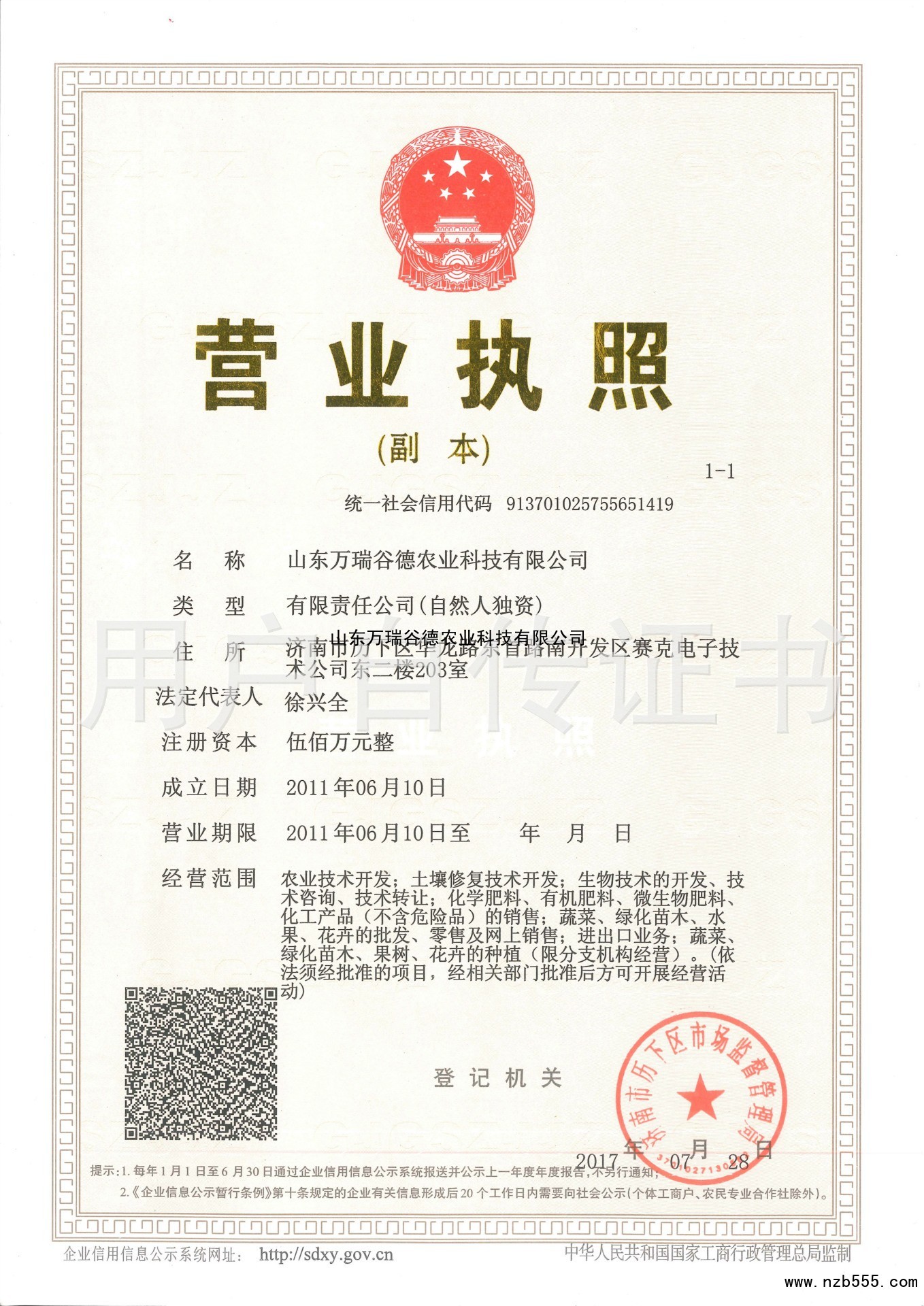 | 發(fā)證機(jī)構(gòu): | 濟(jì)南市歷下區(qū)市場(chǎng)監(jiān)督管理局 | 發(fā)證時(shí)間 : | 2017-07-28 |