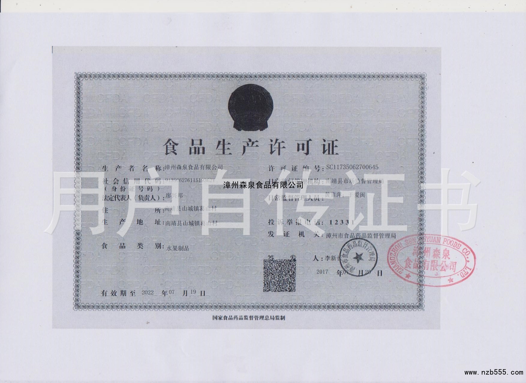 | 發(fā)證機(jī)構(gòu): | 漳州市食品藥品監(jiān)督管理局 | 發(fā)證時(shí)間 : | 2017-07-20 |
