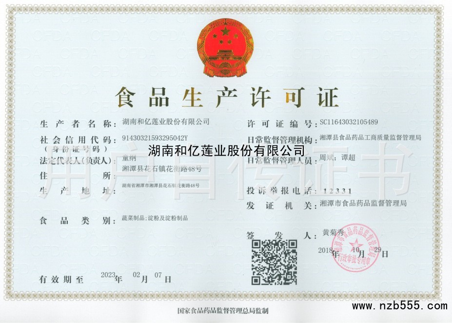 | 發(fā)證機(jī)構(gòu): | 湘潭市食品藥品監(jiān)督管理局 | 發(fā)證時間 : | 2018-10-29 |