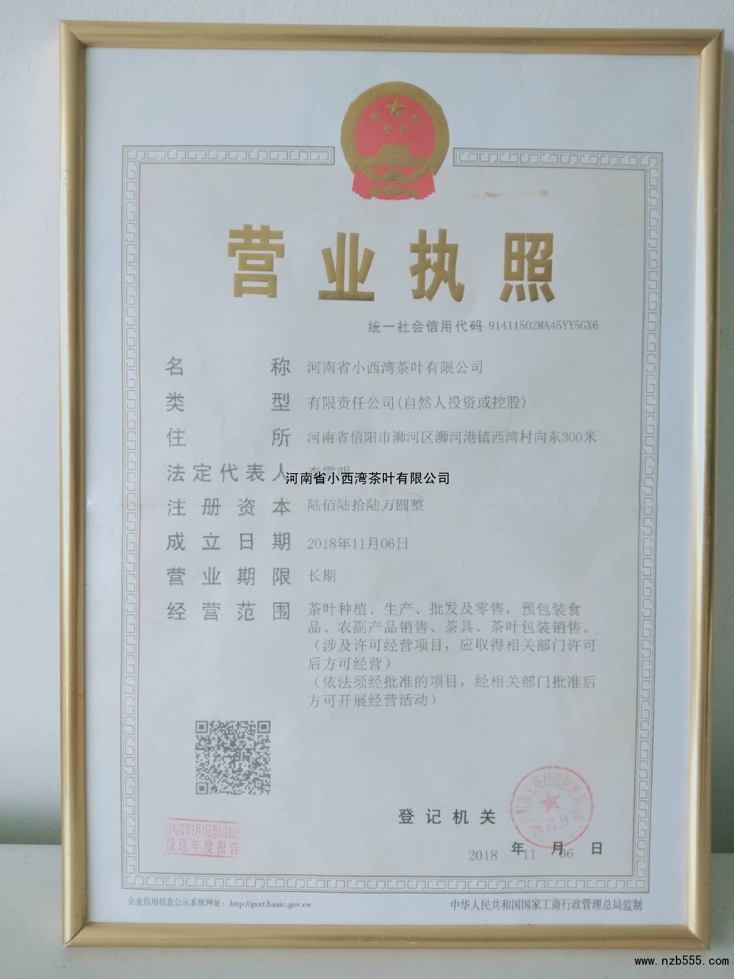 | 發(fā)證機(jī)構(gòu): | 信陽(yáng)市工商行政管理局浉河分局 | 發(fā)證時(shí)間 : | 2018-11-06 |