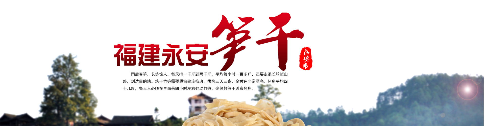 永安市農聯筍干農民專業合作社座落于有著中國十大竹之鄉,中國優秀的旅游城市,中國十大魅力城市——永安市。永安,中國筍竹之鄉,是我國大多數竹子生長的適宜中心產區,永安,竹子的故鄉,這里有享譽海內外的“閩西八大干”之永安筍干,其古老的傳統生產工藝已有悠久的歷史;有建于明朝年間的筍業同業公會舊址——“筍幫公棧”。 滿目青山綠水,放眼竹海,豐富的毛竹資源,名列全國的生態環境和歷史悠久的生產工藝的傳承造就了永安筍干的優良品質。   農聯筍干專業合作社,取永安本土竹筍作為原料,加之本社農戶注重傳統的工藝的傳承以及改進, 既保存好傳統工藝制作出的筍干獨特風味,也提高了筍干的產量。使生產出的肉質肥厚、色澤金黃、筍花明顯、濃郁的原汁原味、特色香味及嫩、脆等獨具一格的品質,深受廣大海內外消費者的好評。 [詳細介紹]