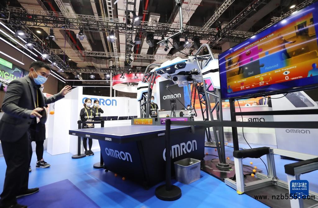 在第三屆中國國際進口博覽會期間,一名男子體驗與歐姆龍公司的一款乒乓球教練機器人對戰,右側屏幕上實時顯示他的心率和情緒指數(2020年11月5日攝)。新華社記者 方喆 攝
