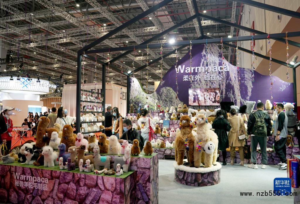 第四屆中國國際進口博覽會消費品展區的秘魯羊駝毛玩偶展臺(2021年11月6日攝)。新華社記者 劉穎 攝