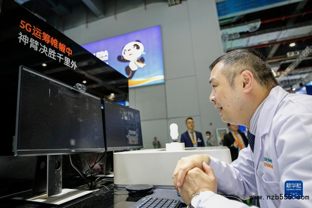 一位超聲科醫生在第二屆中國國際進口博覽會上使用西門子5G醫療遠程超聲解決方案,與重慶市彭水苗族土家族自治縣紹慶街道社區衛生服務中心?的超聲醫生進行遠程實時高清超聲圖像傳輸和音視頻對話(2019年11月6日攝)。新華社記者 張玉薇 攝