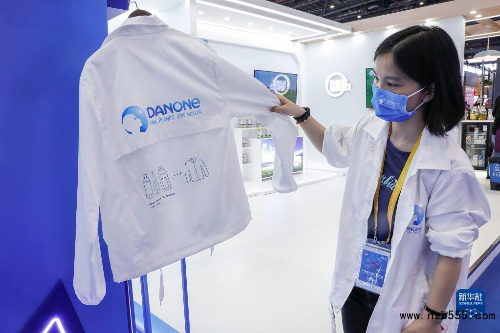 工作人員在第四屆中國國際進口博覽會食品和農產品展區達能展臺展示用塑料飲料空瓶制造的外套(2021年11月6日攝)。新華社記者 張玉薇 攝