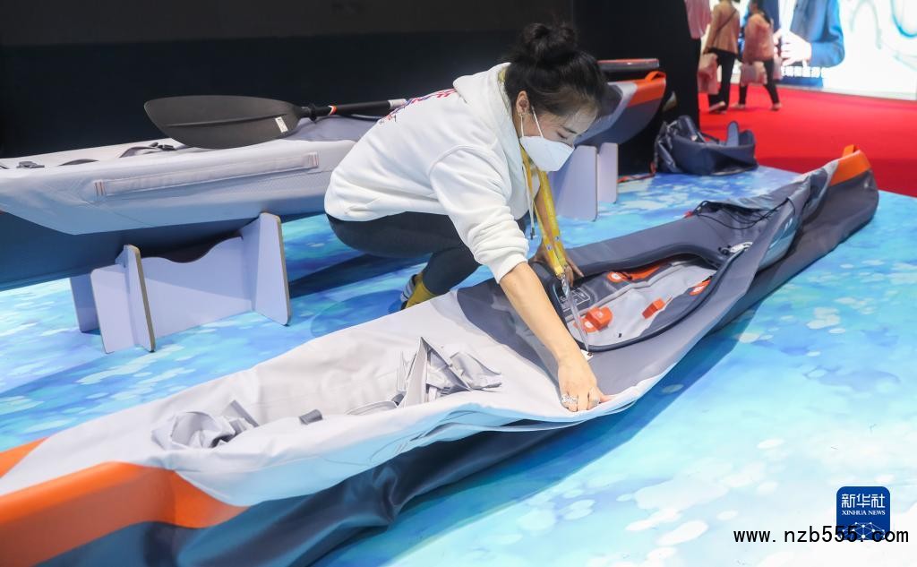 工作人員在第三屆中國國際進口博覽會消費品展區的迪卡儂展臺演示可折疊皮劃艇如何安裝(2020年11月6日攝)。新華社記者 丁汀 攝