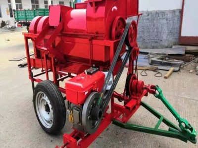 本機(jī)有進(jìn)料斗,滾筒,凹板,架子等組成。工作時撞,將作物來連續(xù)均勻的喂入,作物有滾筒上紋稈于凹板組件的 摩擦,擠壓,碰,抖動使粒子從莖稈上分離,從凹版上流出,莖桿有滾 筒的離心作物射出去,完成脫粒。該機(jī)主要有喂入臺、機(jī)架、凹板篩、滾筒、機(jī)蓋、主風(fēng)機(jī)、吹風(fēng)機(jī)、電 動機(jī)或(柴油機(jī))、振動篩、牽引導(dǎo)向裝置組成為提高籽粒的清潔度,SL-TL-(125 100 75 60 50 40)型脫粒機(jī)設(shè) 計二次清選風(fēng)機(jī),并設(shè)有二次清選風(fēng)機(jī),麥糠、雜物都可通過風(fēng)機(jī)排出機(jī)器外,麥粒落入振動篩底滑板后,從出糧口流出,人工 裝袋。并有兩種機(jī)型,一種為電機(jī)作為動力,另一種是以柴油機(jī)為動力,因此用戶在購買脫粒機(jī)時要根據(jù)自己的動力配備情況選購。 圣魯脫粒機(jī),設(shè)計先進(jìn)、結(jié)構(gòu)緊湊、選用優(yōu)質(zhì)結(jié)構(gòu)鋼材。該機(jī)采用軸流 式滾筒脫粒技術(shù)和可調(diào)風(fēng)量清選技術(shù),對谷粒、谷糠、谷秕、谷草的清選分離,具有分離清、損失小、脫凈率高的優(yōu) 點(diǎn),是科學(xué)院所研究實(shí)驗谷子的理想機(jī)具,是農(nóng)民 脫粒的好幫手。