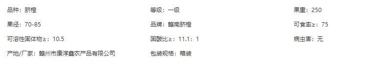 贛南臍橙果大形正,一般每個250克,橙紅鮮艷,光潔美觀,可食率達85%,顏色偏紅,比其他產(chǎn)地的橙子顏色略深;果皮光滑、細膩;果形以橢圓形多見。